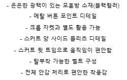 | 1. 제품 소재 (섬유의 조성 또는 혼용률을 백분율로 표시, 기능성인 경우 성적서 또는 허가서) | 상품상세참조 |