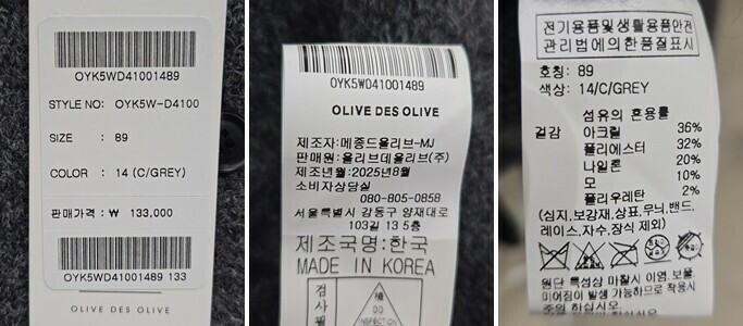 겉감:아크릴36%폴리에스터32%나일론20%모10%폴리우레탄2%