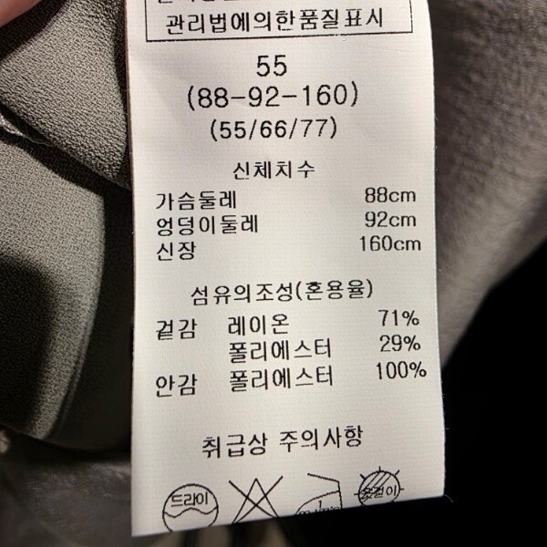 제품소재 : 겉감 레이온 71% 폴리에스터 29% / 안감 폴리에스터 100%