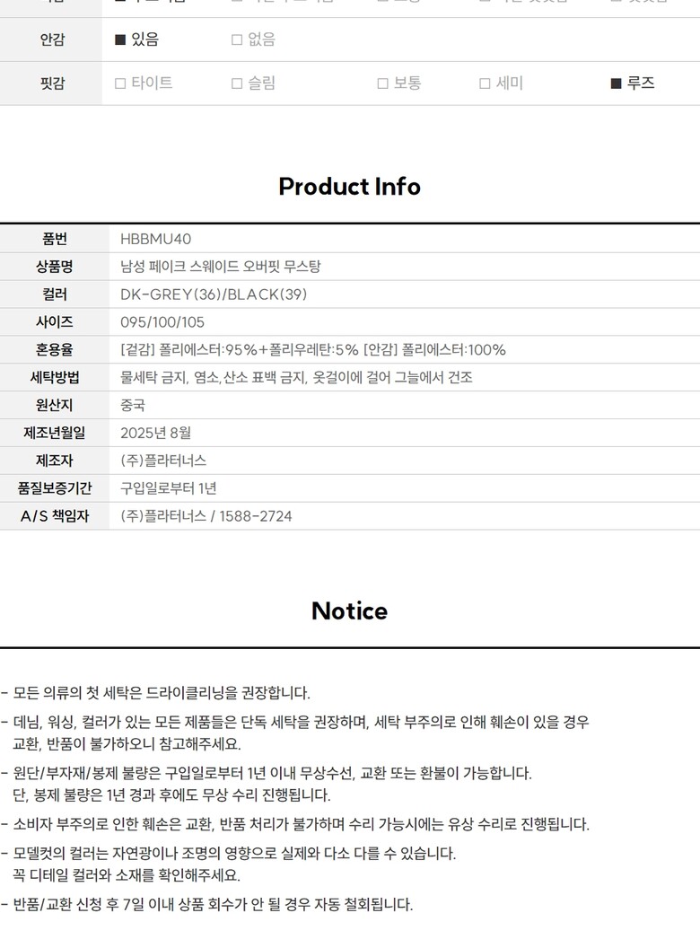 1. 제품 소재 (섬유의 조성 또는 혼용률을 백분율로 표시, 기능성인 경우 성적서 또는 허가서) | [겉감] 폴리에스터:95%+폴리우레탄:5% [안감] 폴리에스터:100% |