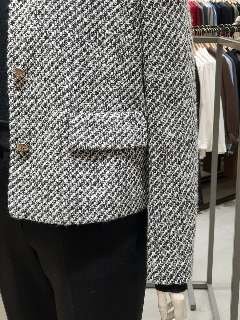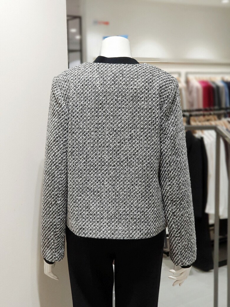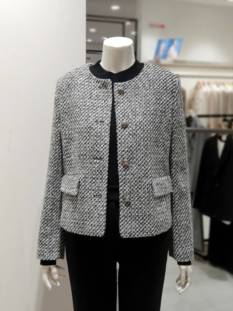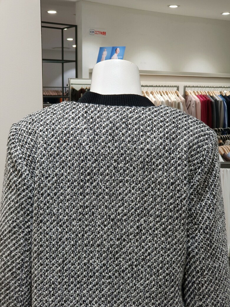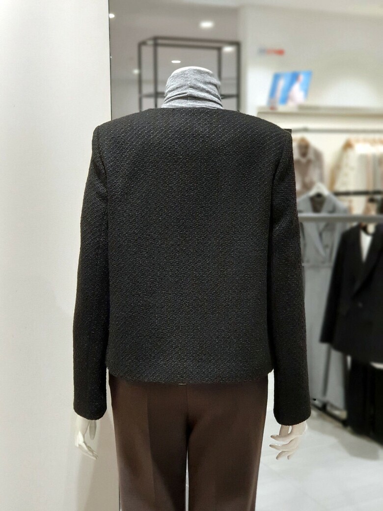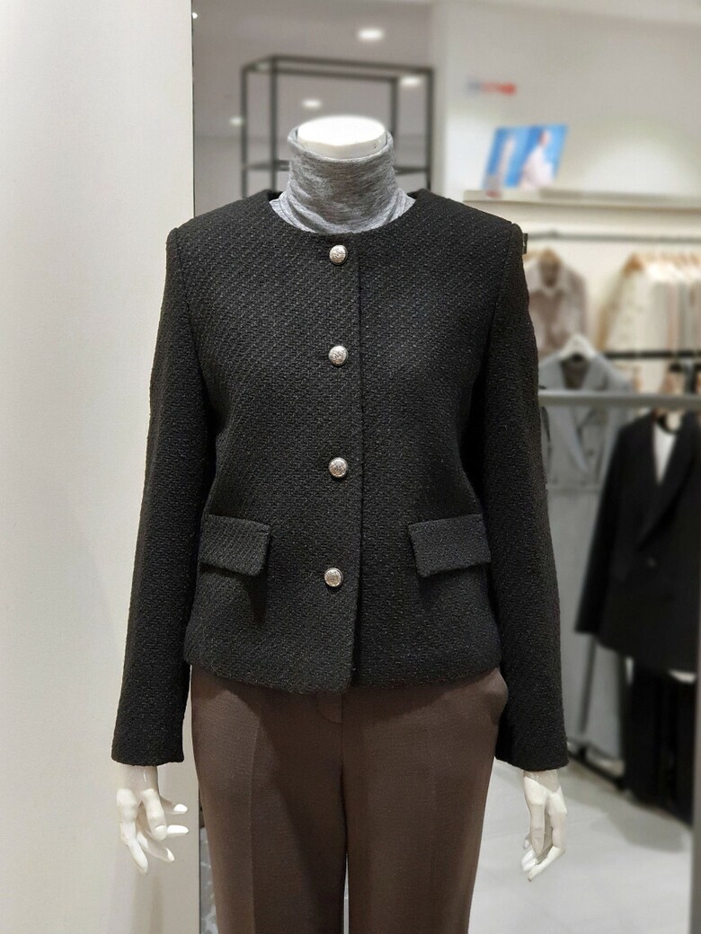 고급스러운 트위드 소재가 매력적인 노카라 재킷입니다.