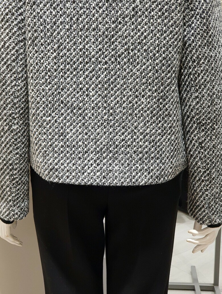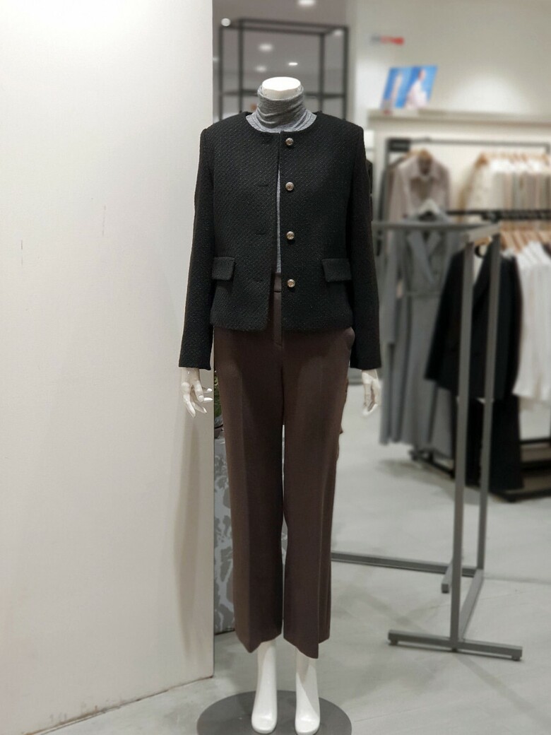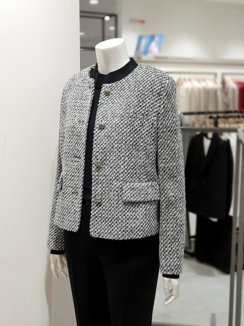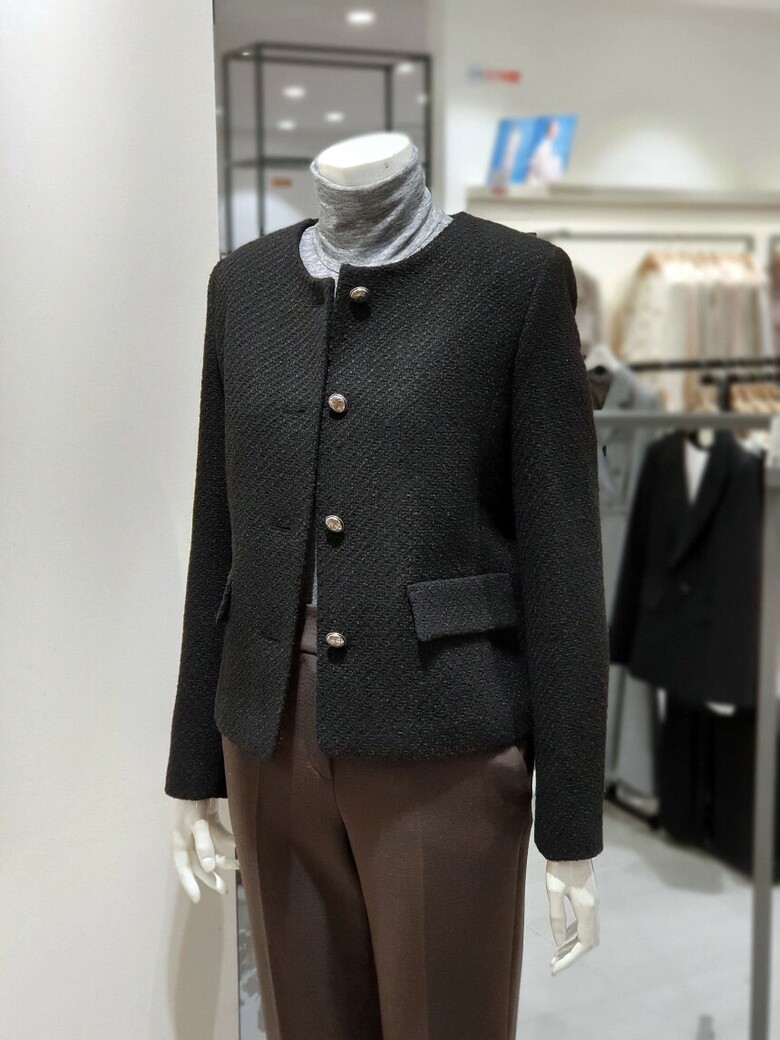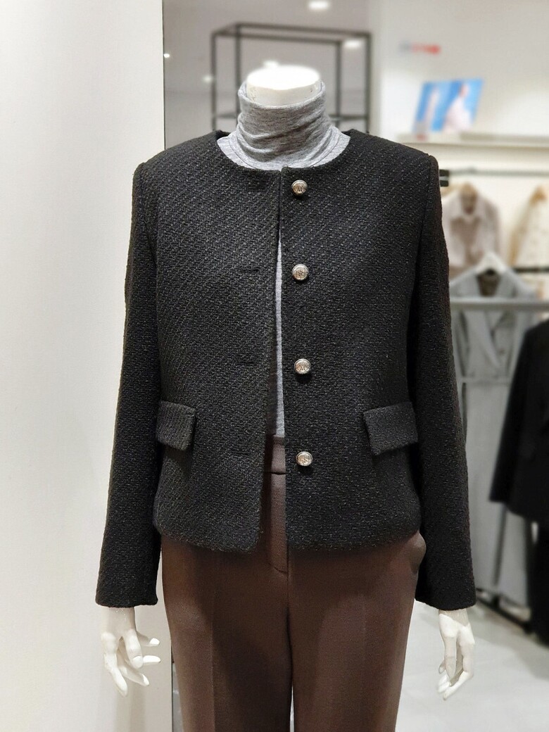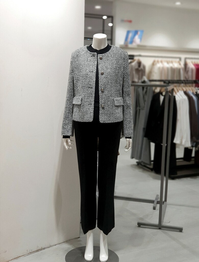 고급스러운 트위드 소재가 매력적인 노카라 재킷입니다.