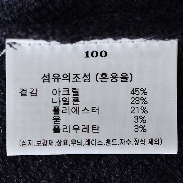 제품소재 : 아크릴45%나일론28%폴리에스터21%울3%폴리우레탄3%