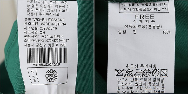 | 1. 제품 소재 (섬유의 조성 또는 혼용률을 백분율로 표시, 기능성인 경우 성적서 또는 허가서) | 겉감-면100% |