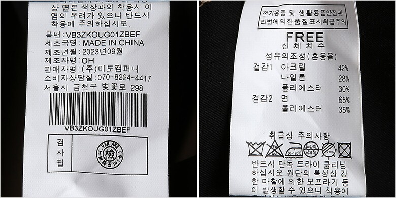 | 1. 제품 소재 (섬유의 조성 또는 혼용률을 백분율로 표시, 기능성인 경우 성적서 또는 허가서) | 겉감1-폴리에스터30% 나일론28% 아크릴42% 겉감2-폴리에스터35% 면65% |