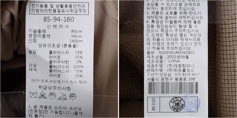 | 1. 제품 소재 (섬유의 조성 또는 혼용률을 백분율로 표시, 기능성인 경우 성적서 또는 허가서) | 겉감-폴리에스터73% 폴리우레탄2% 레이온25% 안감-폴리에스터100% 배색-폴리에스터75%레이온25% |