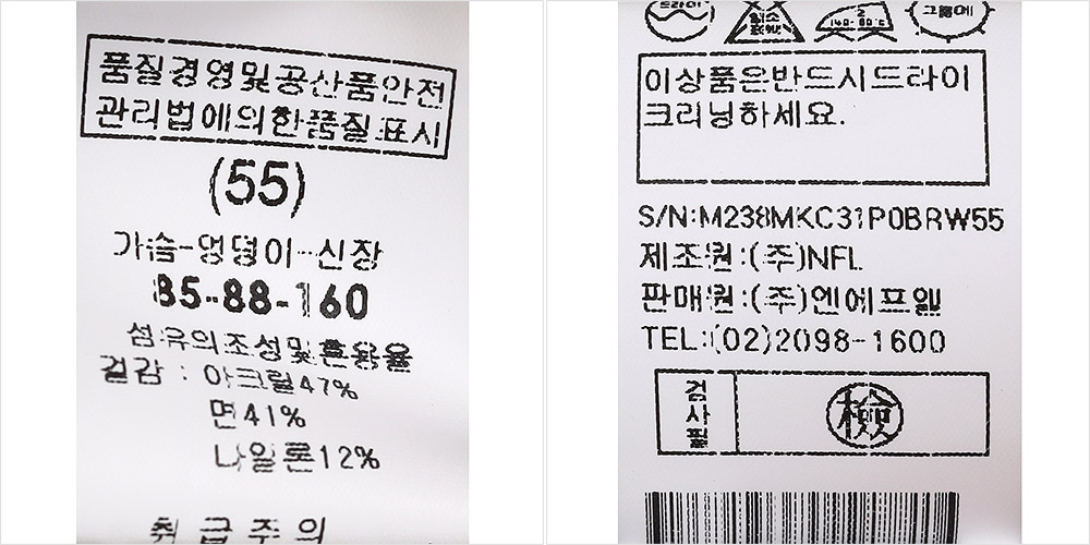 | 1. 제품 소재 (섬유의 조성 또는 혼용률을 백분율로 표시, 기능성인 경우 성적서 또는 허가서) | 겉감-면41% 나일론12% 아크릴47% |