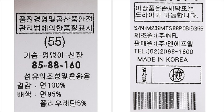 1. 제품 소재 (섬유의 조성 또는 혼용률을 백분율로 표시, 기능성인 경우 성적서 또는 허가서) 겉감-면100% 배색-면95% 폴리우레탄 5%