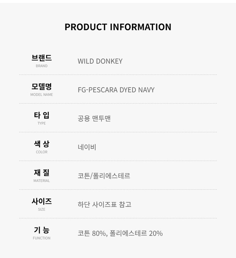 와일드동키 FG-PESCARA DYED NAVY 공용 맨투맨 티셔츠