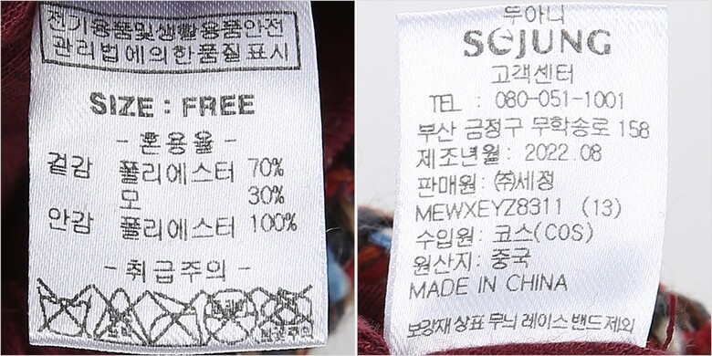 | 2. 소재 | 겉감:폴리에스터70% 모30% 안감:폴리에스터100% |