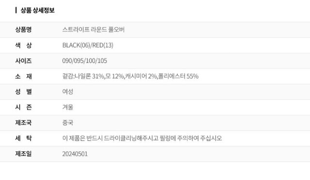 | 1. 제품 소재 (섬유의 조성 또는 혼용률을 백분율로 표시, 기능성인 경우 성적서 또는 허가서) | 상품상세참조 |