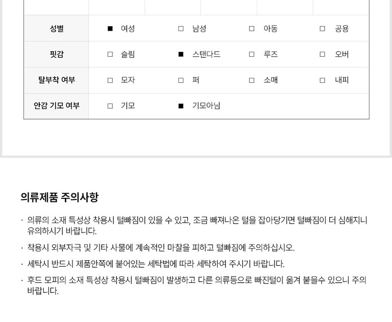 | 6. 세탁방법 및 취급시 주의사항 | 반드시 라벨에 부착된 세탁방법으로 세탁해 주십시오. |