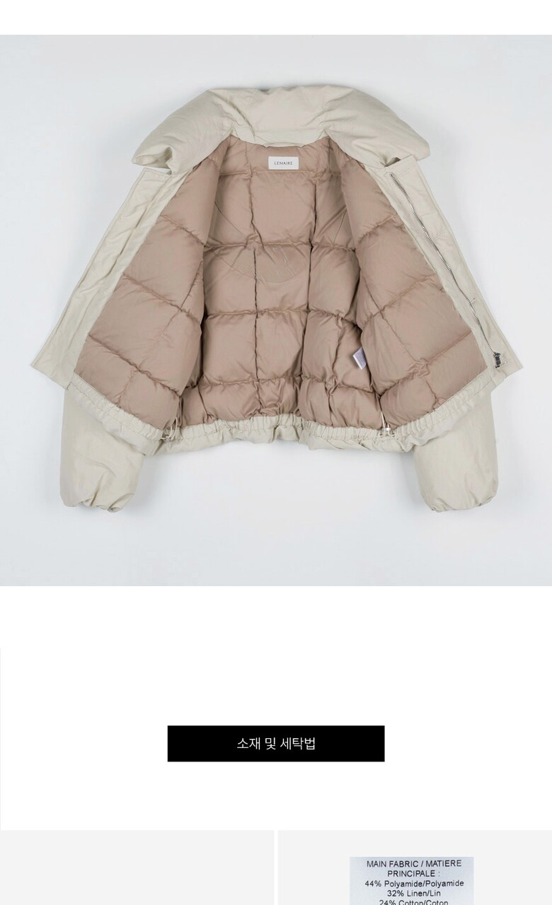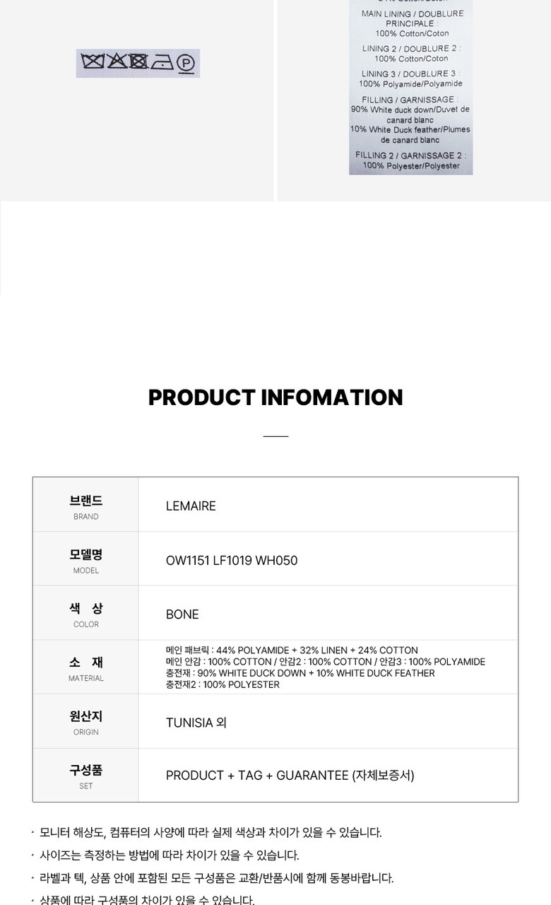 | 1. 제품 소재 (섬유의 조성 또는 혼용률을 백분율로 표시, 기능성인 경우 성적서 또는 허가서) | 메인 패브릭 : 폴리아미드 44% + 리넨 32% + 코튼 24% / 메인 안감 : 코튼 100% / 안감2 : 코튼 100% / 안감3 : 폴리아미드 100% / 충전재 : 화이트 덕다운 90% + 화이트 덕페더 10% / 충전재2 : 폴리에스터 100% |