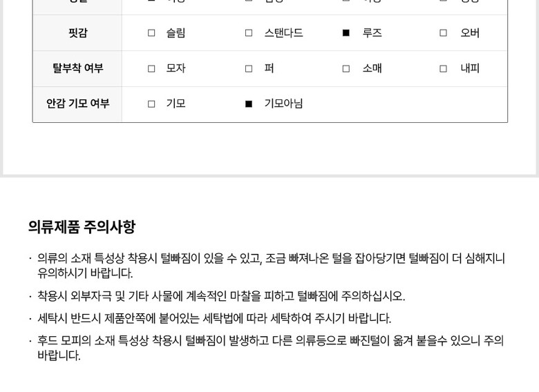 | 6. 세탁방법 및 취급시 주의사항 | 반드시 라벨에 부착된 세탁방법으로 세탁해 주십시오. |