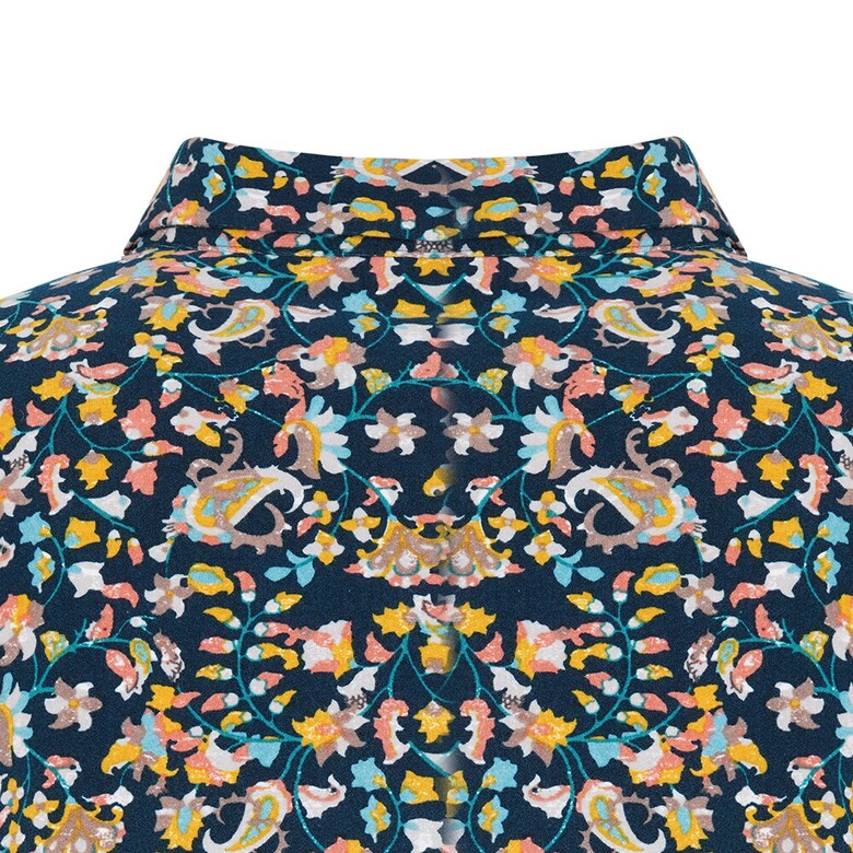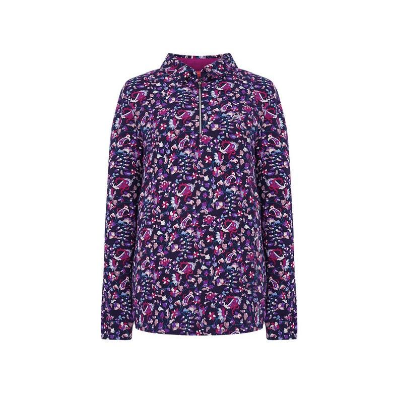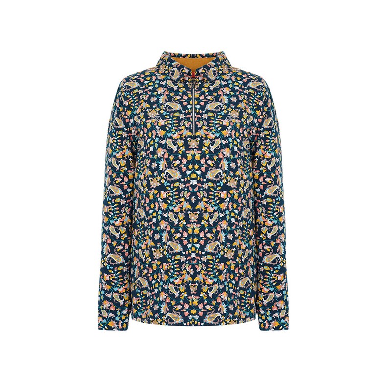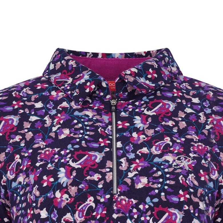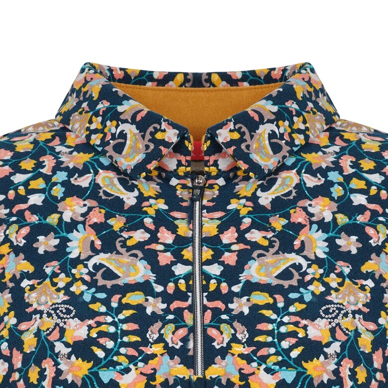 코트나 양기모 소재를 사용하여 촉감이 부드럽고 보온성이 있으며 전판 기하학프린트와 아시밴드 안쪽의 컬러 포인트 배색이 멋스러운 카라 티셔츠
