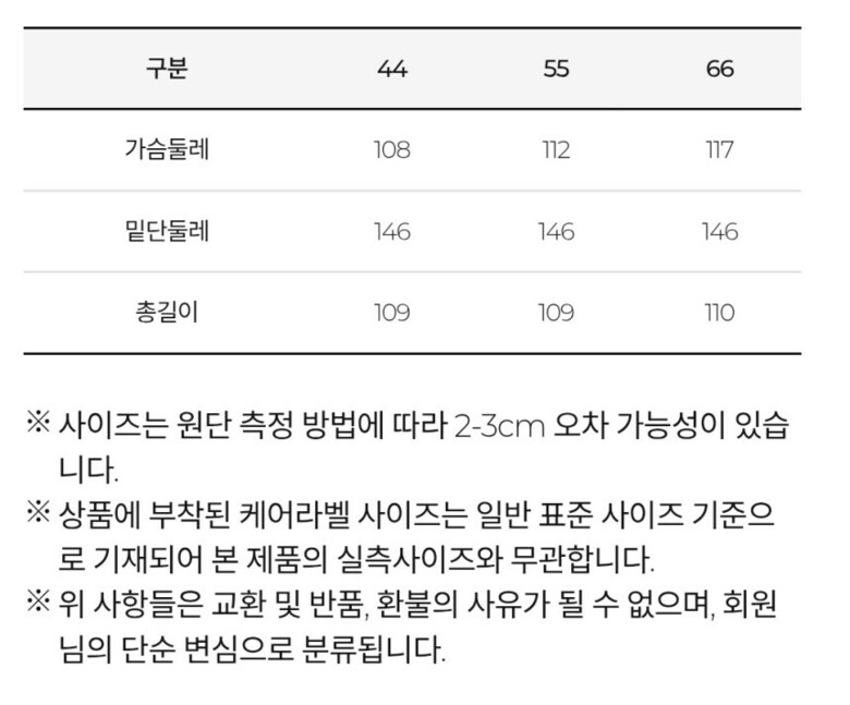 • 처음 배송된 상품상태와 다를 경우(세탁/착용 후 외출하신 경우) 반품이 불가합니다.