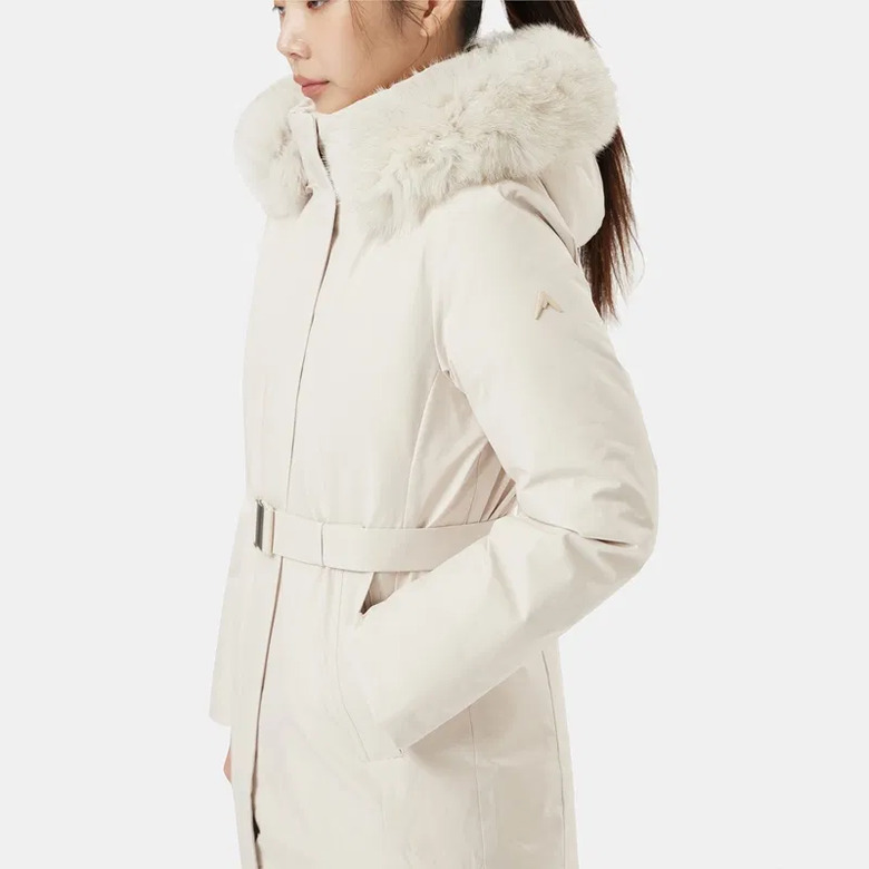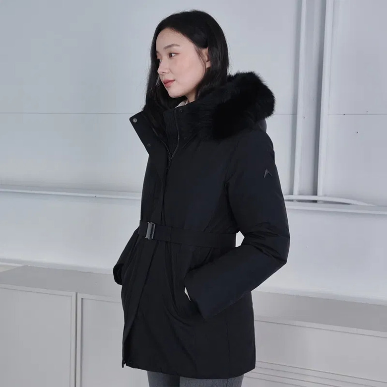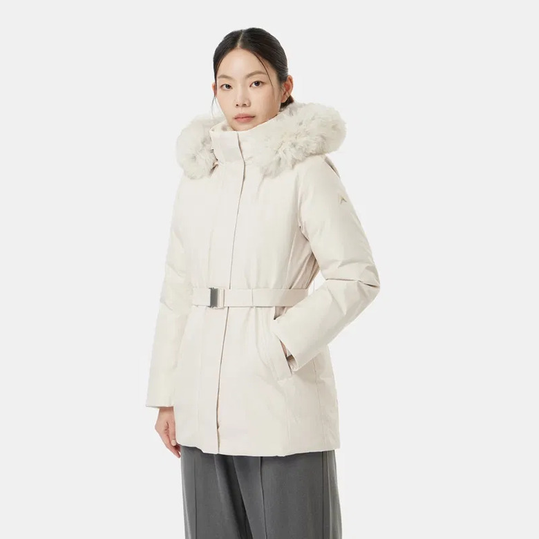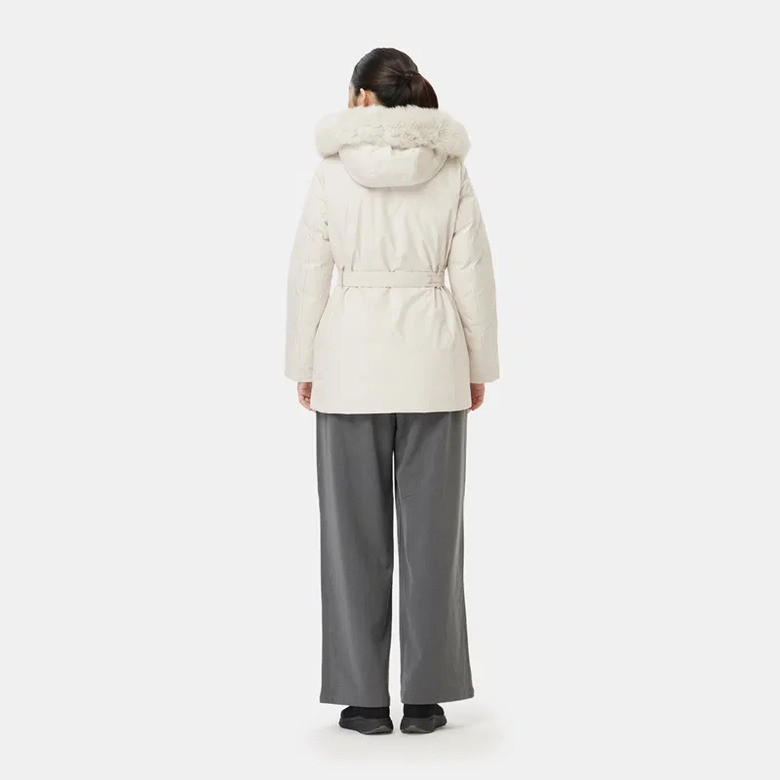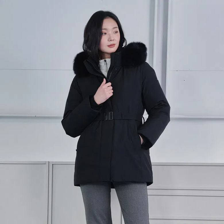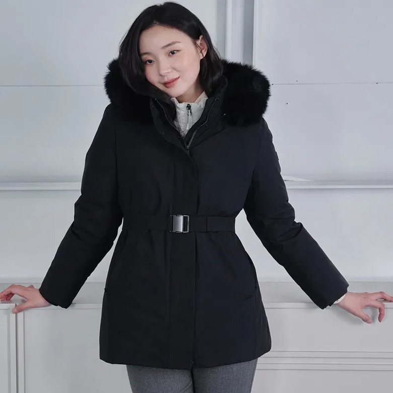 겉감 폴리에스터 100% / 배색1 폴리에스터 100% / 배색2 천연모피(여우) 100% / 벨트 폴리에스터 80% / 벨트 고무사(지정외) 20% / 소맷단 폴리우레탄 3% / 소맷단 폴리에스터 97% / 안감1 나일론 100% / 안감2 나일론 100% / 주머니안감 폴리에스터 100% / 충전재 거위깃털 20% / 충전재 거위솜털 80%