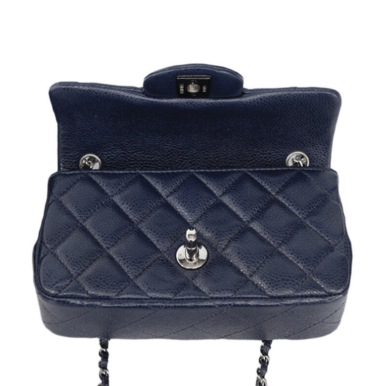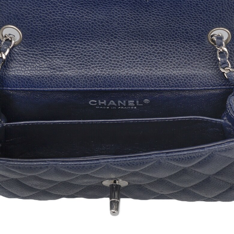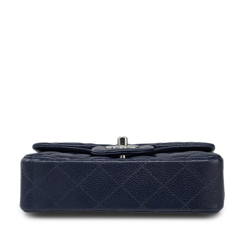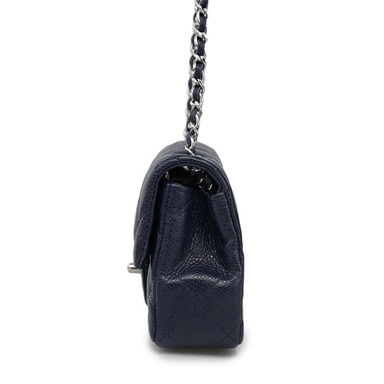 [중고명품] 샤넬 다크 네이비 캐비어 클래식 플랩 은장 체인 미니 숄더백