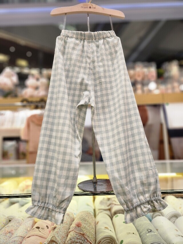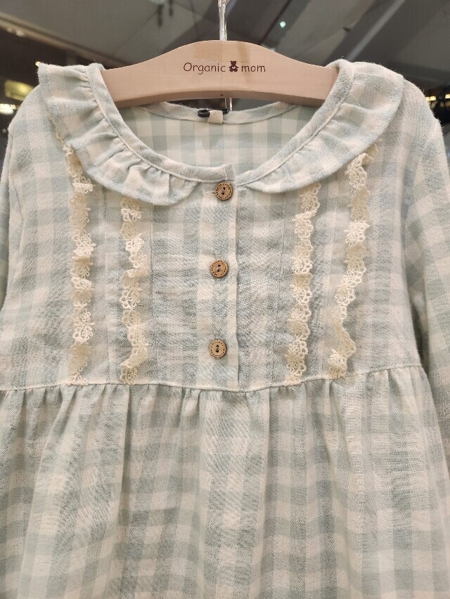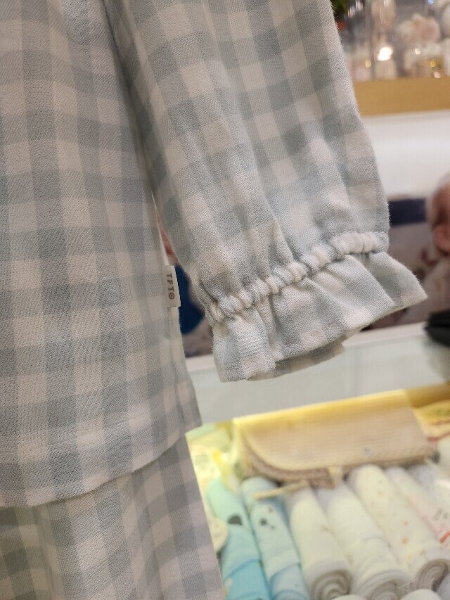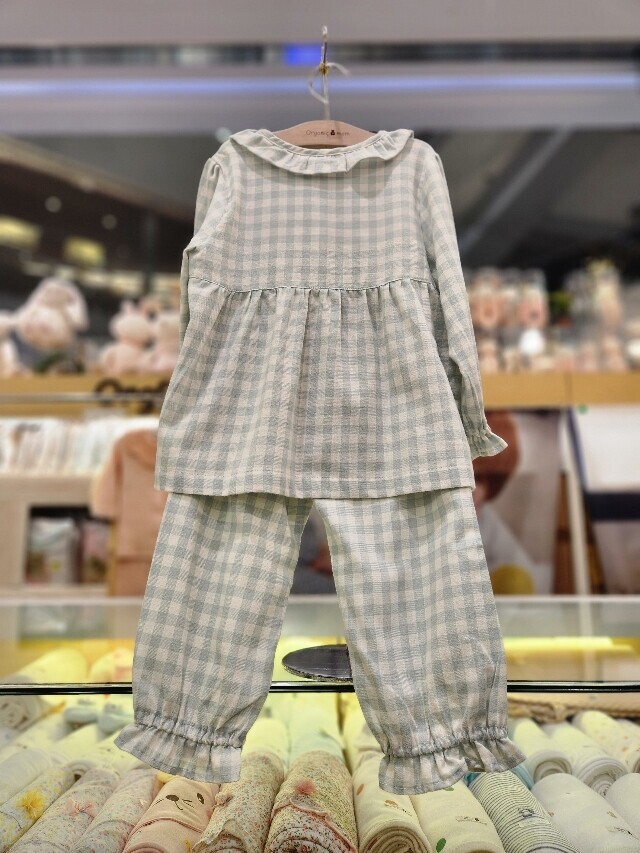 플란넬 트윌 기모 소재를 사용한 따뜻하고 편안하게 입을 수 있는 심플한 체크 무늬 잠옷입니다. 부드러운 그린 컬러에 A라인 옆선과 소매단과 밑단에 프릴단을 더하여 여성스러움과 활동성을 준 디자인입니다.