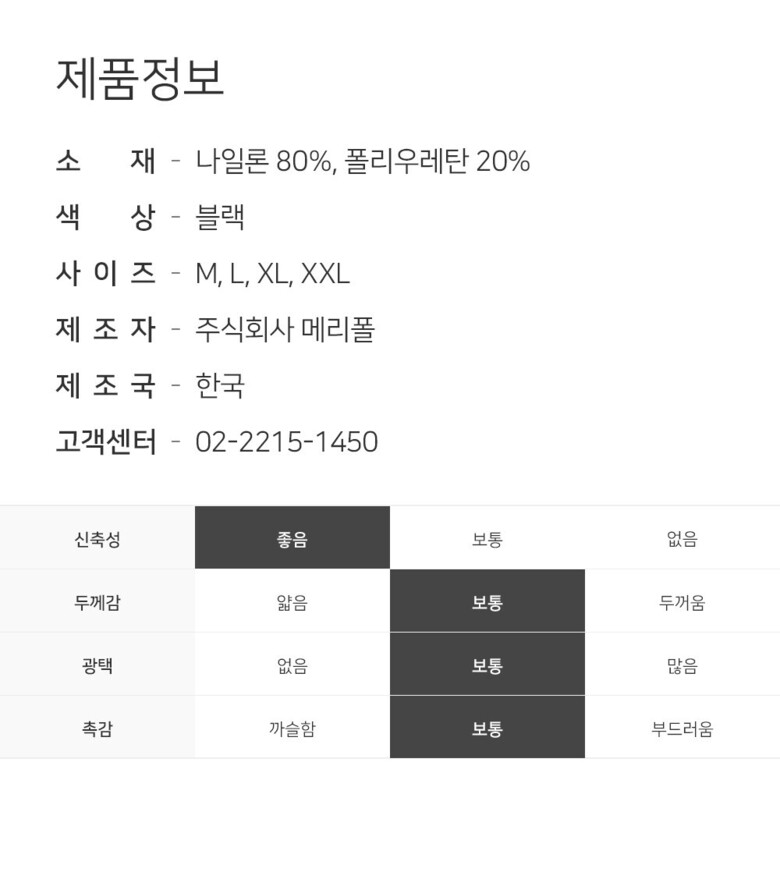 | 1. 제품 소재 (섬유의 조성 또는 혼용률을 백분율로 표시, 기능성인 경우 성적서 또는 허가서) | 나일론 80%, 폴리우레탄 20% |