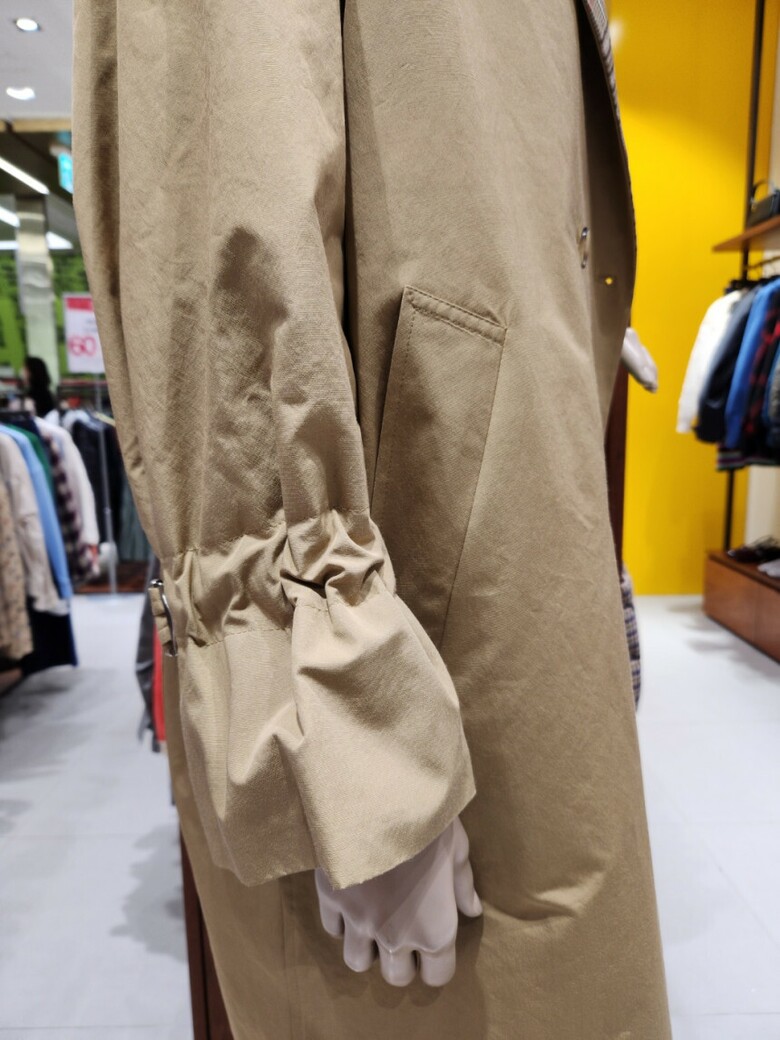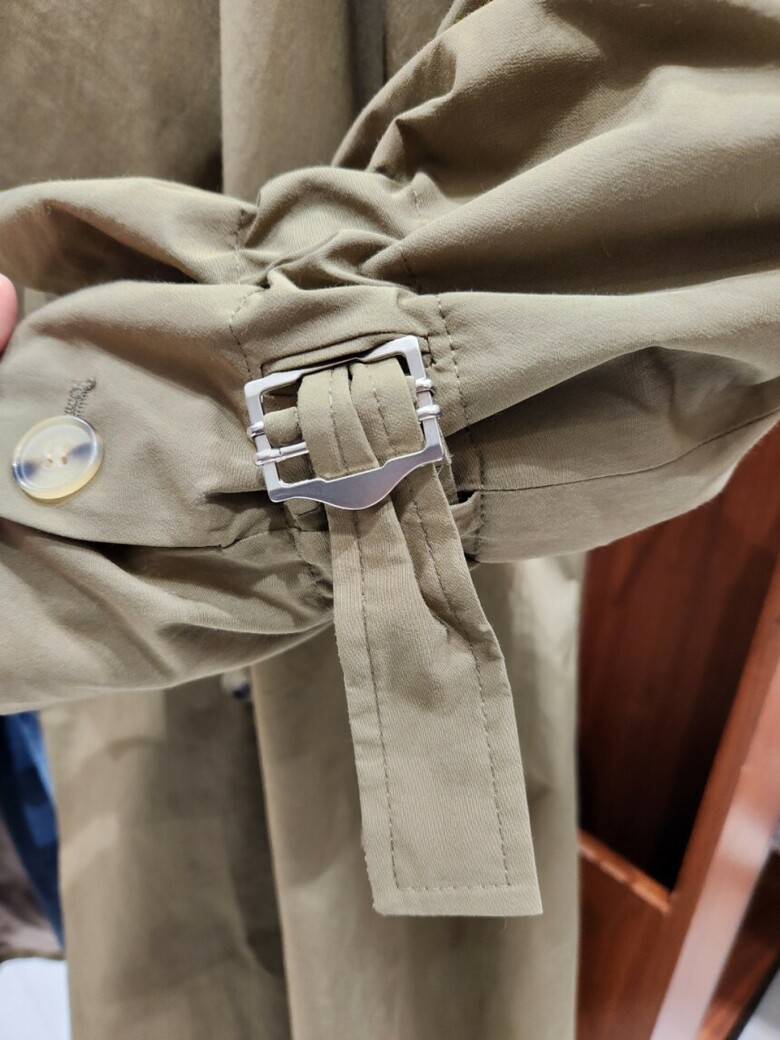 소매단의 스트랩 벨트와 단추 여밈으로 실루엣 조절이