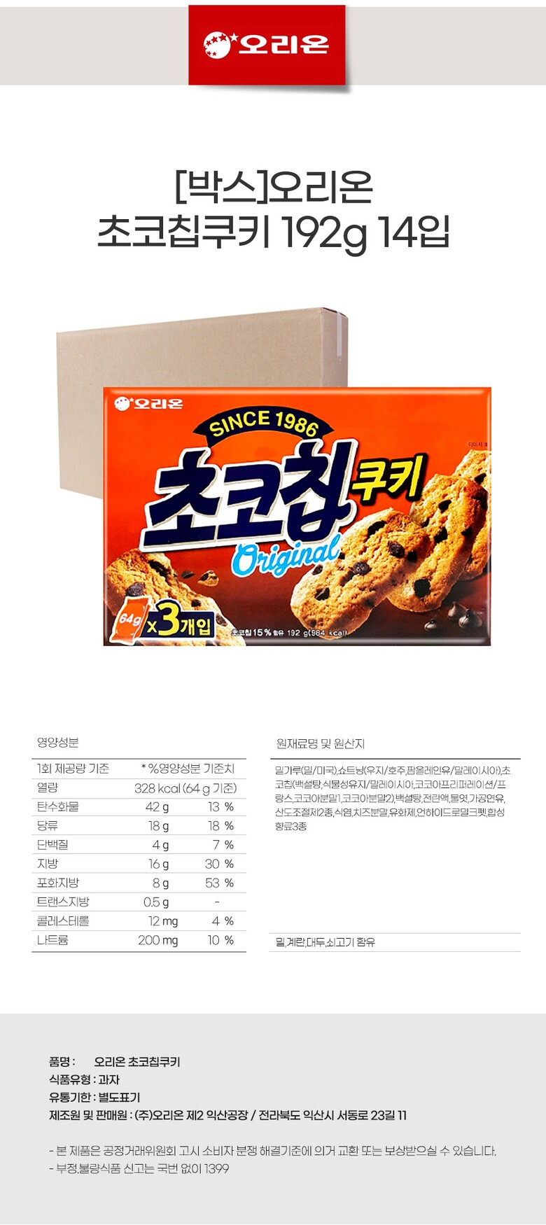 | 1. 포장단위별 용량(중량),수량,크기 | [박스]오리온 초코칩쿠키 192g 14입 (2688g) |