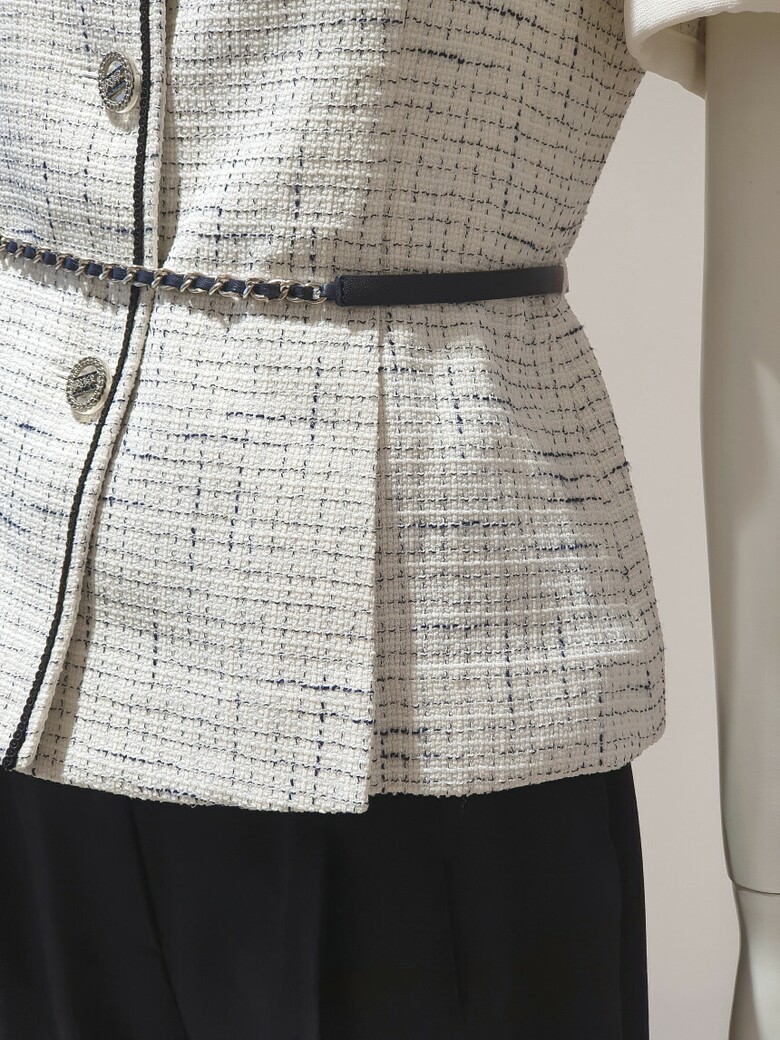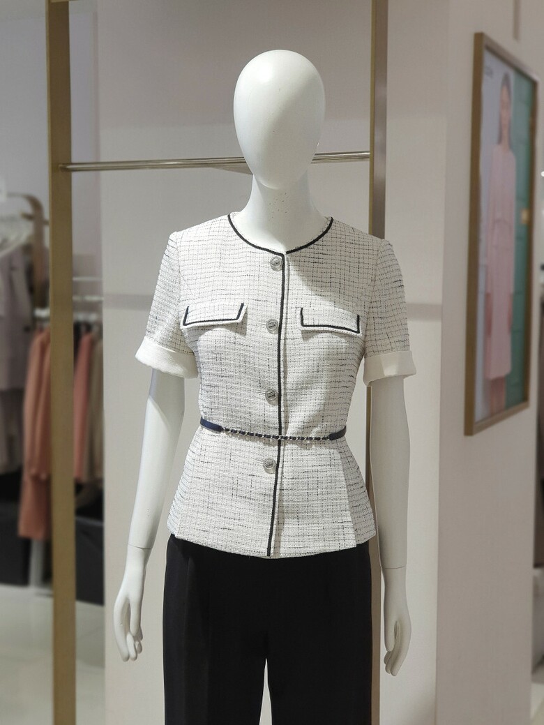 네크라인을 따라 배색 디테일로 맵시를 더해주는 재킷입니다.