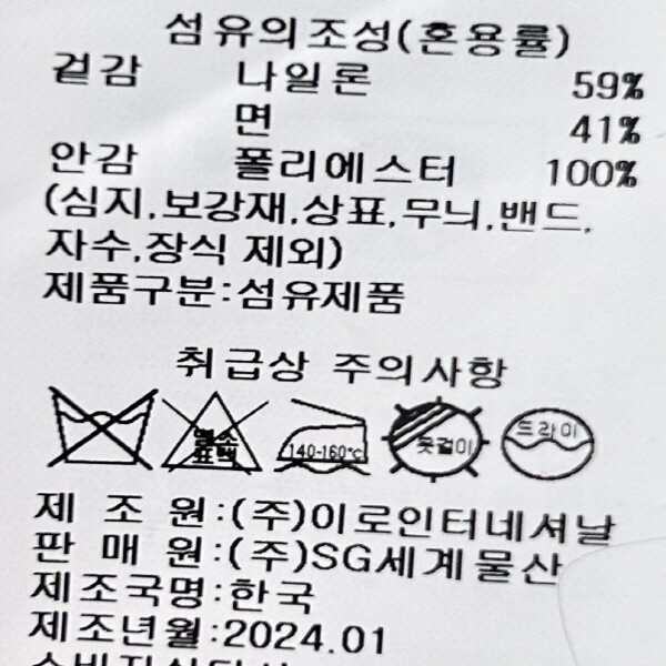 제품소재 : 겉감-나일론59% 면41% 안감-폴리에스터100%