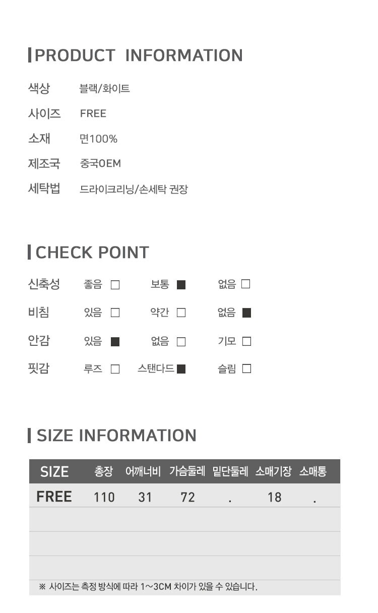 | 1. 제품 소재 (섬유의 조성 또는 혼용률을 백분율로 표시, 기능성인 경우 성적서 또는 허가서) | 상세페이지참고 |