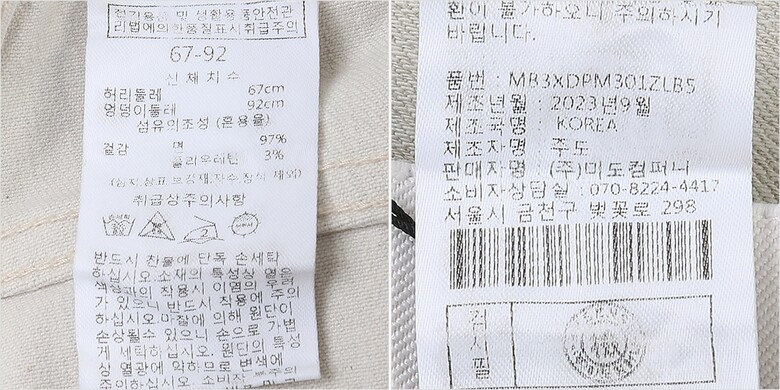 | 1. 제품 소재 (섬유의 조성 또는 혼용률을 백분율로 표시, 기능성인 경우 성적서 또는 허가서) | 겉감:면97% 폴리우레탄3% |