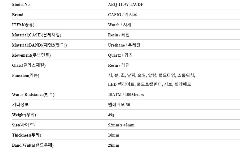 카시오 CASIO AEQ-110W-1AVDF 남성 시계