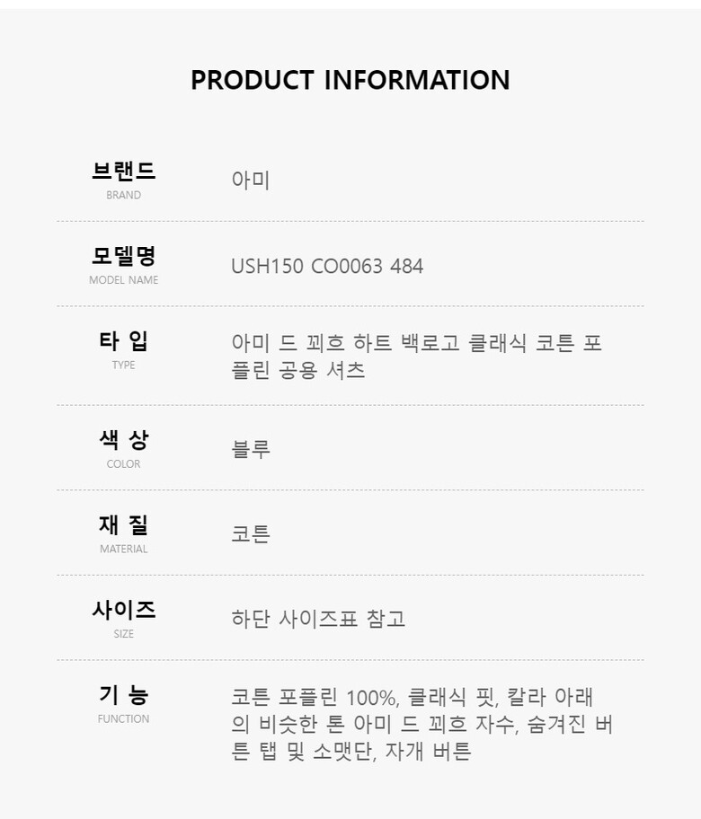 아미 AMI USH150 CO0063 484 아미 드 꾀흐 하트 백로고 클래식 코튼 포플린 공용 셔츠