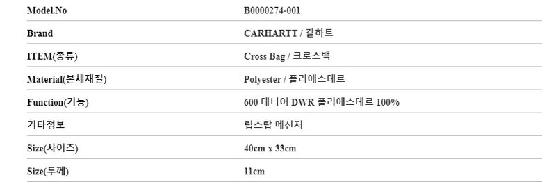 칼하트 가방 B0000274-001 메신저백 립스탑 남성크로스백 여성크로스백 당일발송