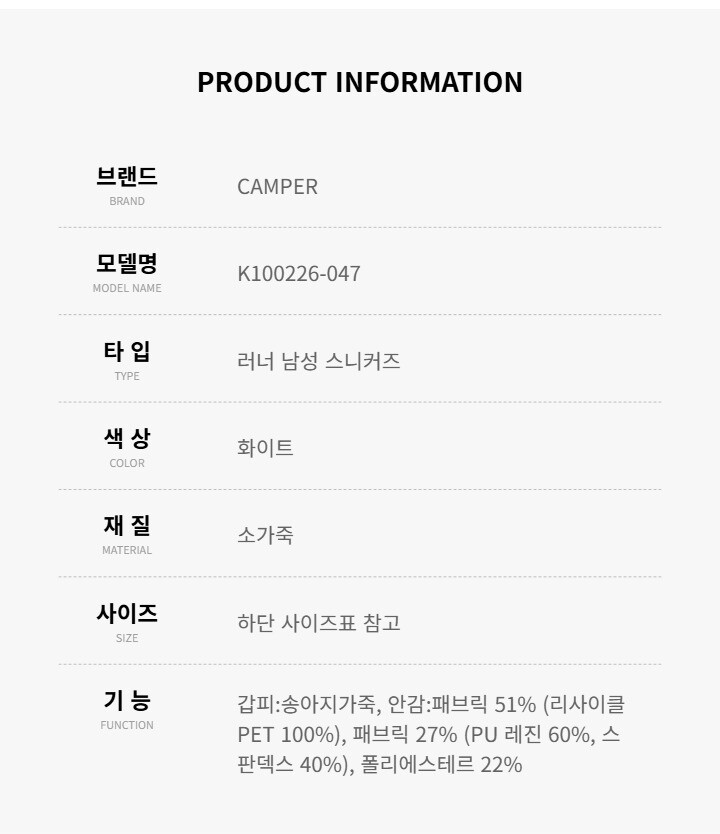 캠퍼 스니커즈 K100226-047 러너 남성스니커즈 남자스니커즈 당일발송