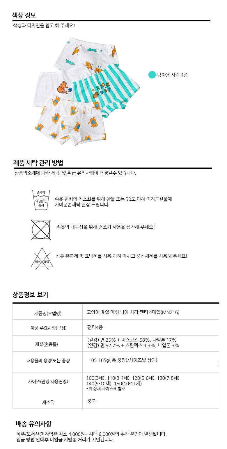 고양이휴일 매쉬 남아 사각팬티 4매(MN216)
