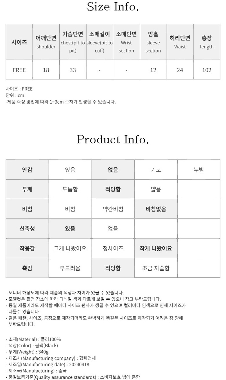 어깨단면 / 가슴단면 / 소매길이 / 소매단면 / 암홀 / 허리단면 / 총장 (FREE)18 / 33 / - / - / 12 / 24 / 102