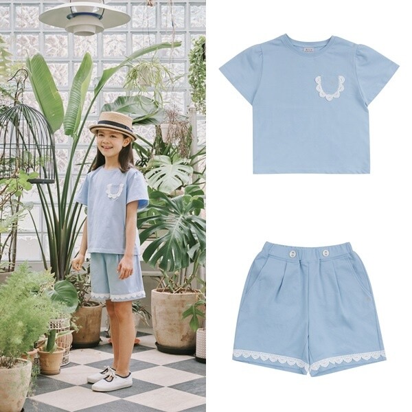산뜻한 스카이 블루 컬러의 반팔티셔츠와 반바지 셋업입니다.