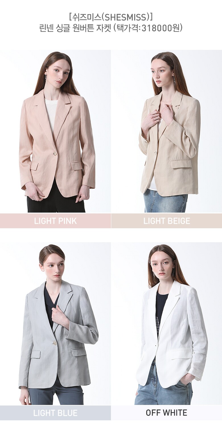 ▶ ITEM : 린넨 싱글 원버튼 자켓 ▶ NUMBER : SWWJKM22040 ▶ FABRIC : [겉감] 마 100% ▶ WASHING : 단독드라이(고온불가.미어짐.필링.이염) ▶ 원 산 지 : 베 트 남 ▶ 색 상 : 라이트베이지(LB),라이트블루(LL),라이트핑크(LP)