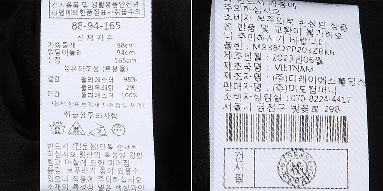 | 1. 제품 소재 (섬유의 조성 또는 혼용률을 백분율로 표시, 기능성인 경우 성적서 또는 허가서) | 겉감-폴리에스터98% 폴리우레탄2% 안감-폴리에스터100% |