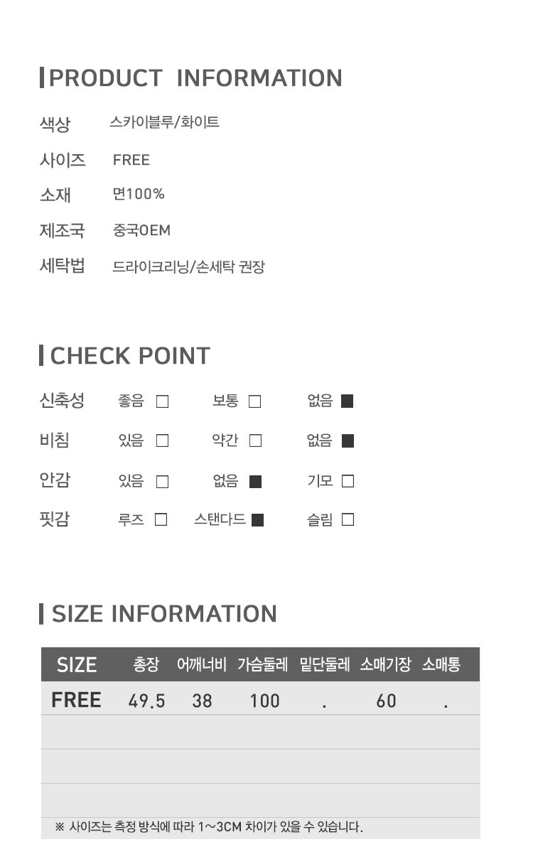 | 1. 제품 소재 (섬유의 조성 또는 혼용률을 백분율로 표시, 기능성인 경우 성적서 또는 허가서) | 상세페이지참고 |