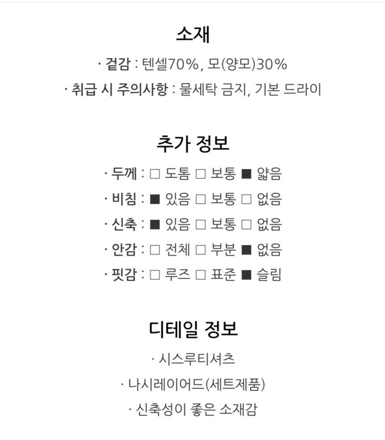 | 1. 제품 소재 (섬유의 조성 또는 혼용률을 백분율로 표시, 기능성인 경우 성적서 또는 허가서) | 상품상세참조 |