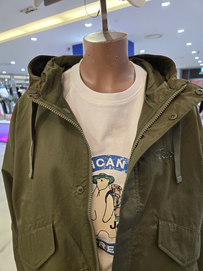 앞가슴에 Jeep. 흘림체 직자수와 소매 와펜으로 포인트를 주었습니다.