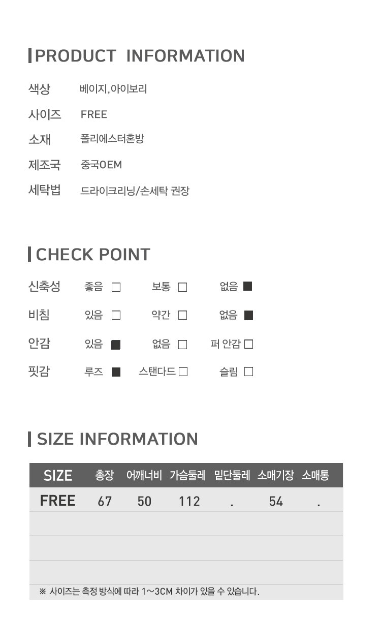 | 1. 제품 소재 (섬유의 조성 또는 혼용률을 백분율로 표시, 기능성인 경우 성적서 또는 허가서) | 상세페이지참고 |