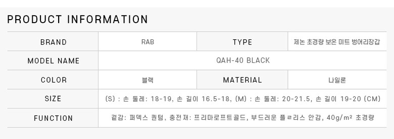 랩 QAH-40 BLACK 제논 초경량 보온 미트 벙어리 장갑