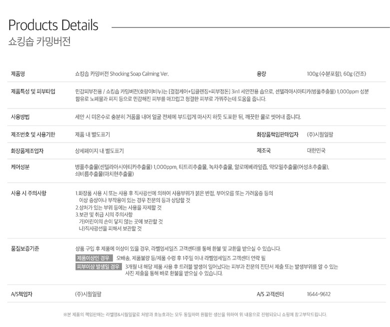 | 8. 기능성 화장품의 경우 화장품법에 따른 식품의약품안전청 심사 필 유무 | 상세페이지 참조 |