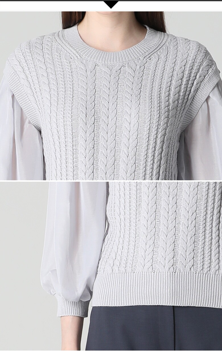 소매에 니트의 질감은 그대로 살리면서 시스루에 유연한 블라우스 소재를 블록하여 포인트를 준 니트입니다. 브랜드만의 고급원단으로 우수한 착용감을 선사합니다. 서로 대비되는 소재가 유니크한 디자인이 돋보이는 아이템입니다.