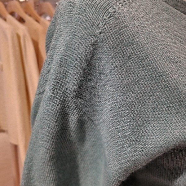 섬유 특유의 냄새,마소재의 올 뭉침,니트 소재 특성상 실이 올라와 있거나 마감선이 튀어나오는 점
