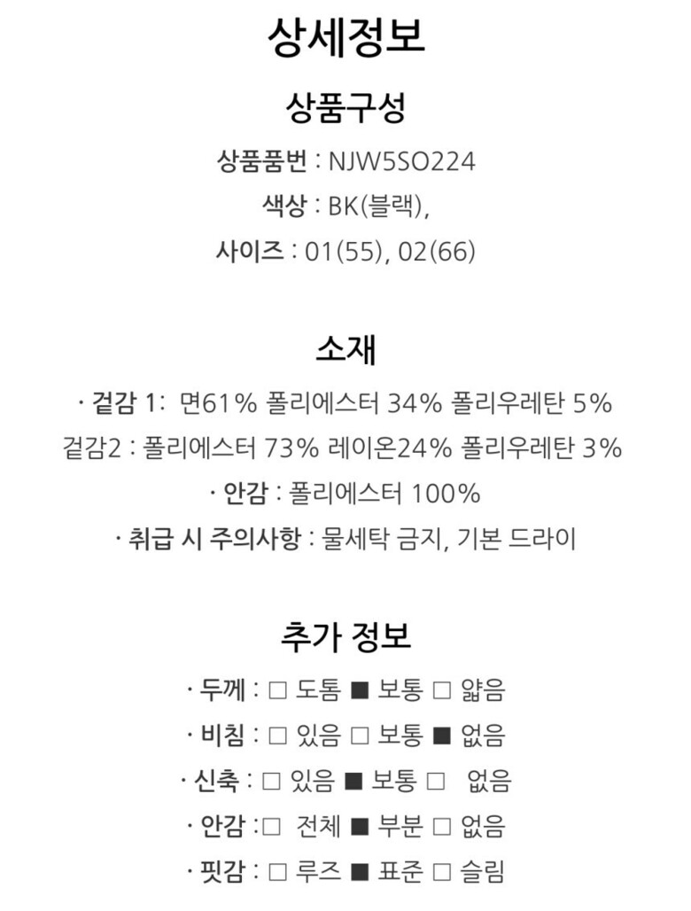 | 6. 세탁방법 및 취급시 주의사항 | 상품상세참조 |