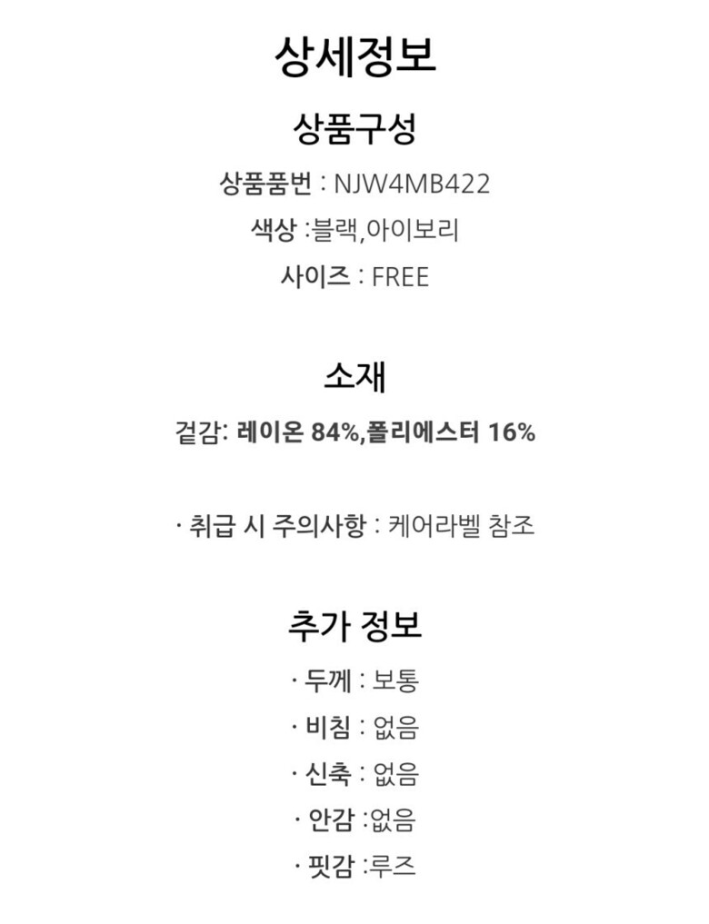 | 1. 제품 소재 (섬유의 조성 또는 혼용률을 백분율로 표시, 기능성인 경우 성적서 또는 허가서) | 상품상세참조 |