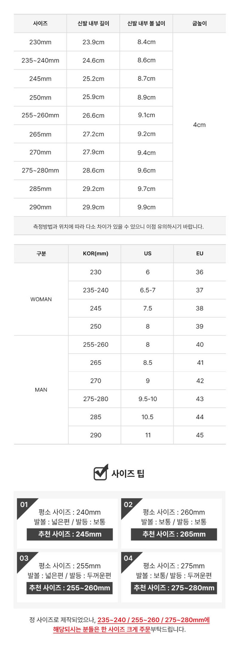 | 3. 치수 | 230mm,235~240mm,245mm,250mm,255~260mm,265mm,270mm,275~280mm |